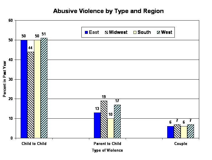 Regional Rates of Abusive Violence. The following graph depicts regional variations in three types of abusive violence. It shows that acts of violence between siblings (child-to-child) are by far the most common form of domestic violence, even though this type of abuse is rarely portrayed as a "social problem." Another interesting finding is the relatively low rate of parent-to-child violence in the South, which contrasts with stereotypic views of the South as an especially violent region. |