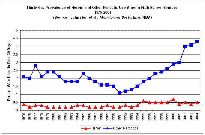 Heroin and Other Narcotic UseIn contrast to relatively stable patterns of use for marijuana, cocaine, heroin (shown below) and many other illegal drugs over the past decade, the thirty-day prevalence of "other narcotic use" by high school seniors has steadily increased since the early 1990s. "Other Narcotics" include opiate-type (or "opioid") prescription drugs such as codeine and Demerol when used outside of medical supervision. In 2002 several new drugs, including OxyContin (Oxycodone) and Vicodin (Hydrocodone), were added to the list of other narcotics in the MTF survey, which accounts in part for a sharp jump in thirty-day prevalence between 2001 and 2002. Overall, monthly prevalence estimates for the use of other narcotics have quadrupled since 1991, and non-medical use of these addictive drugs now ranks fifth in prevalence among high-school seniors behind the use of alcohol, tobacco, marijuana, and amphetamines. | ||